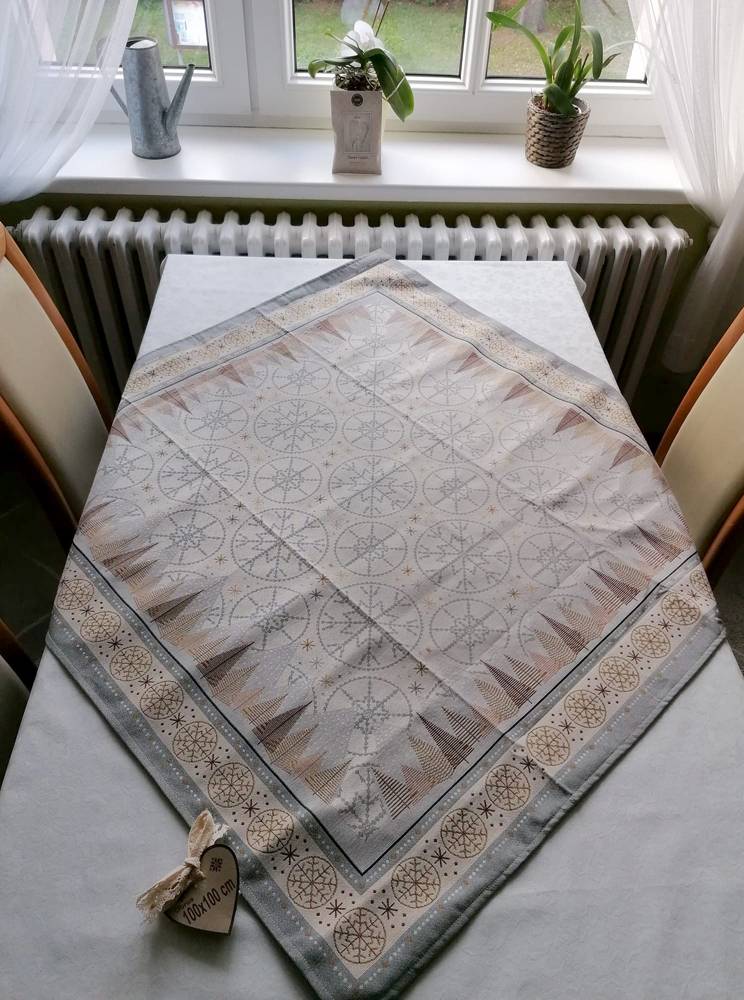 Gobelínové ubrusy v zimním a vánočním stylu. Ubrus je zdoben vánočně laděným motivem stromů a vloček v šedo béžové barvě. Ubrusy se budou skvěle hodit do vašeho pokoje a můžete si tak vytvořit dokonalou zimní atmosféru.